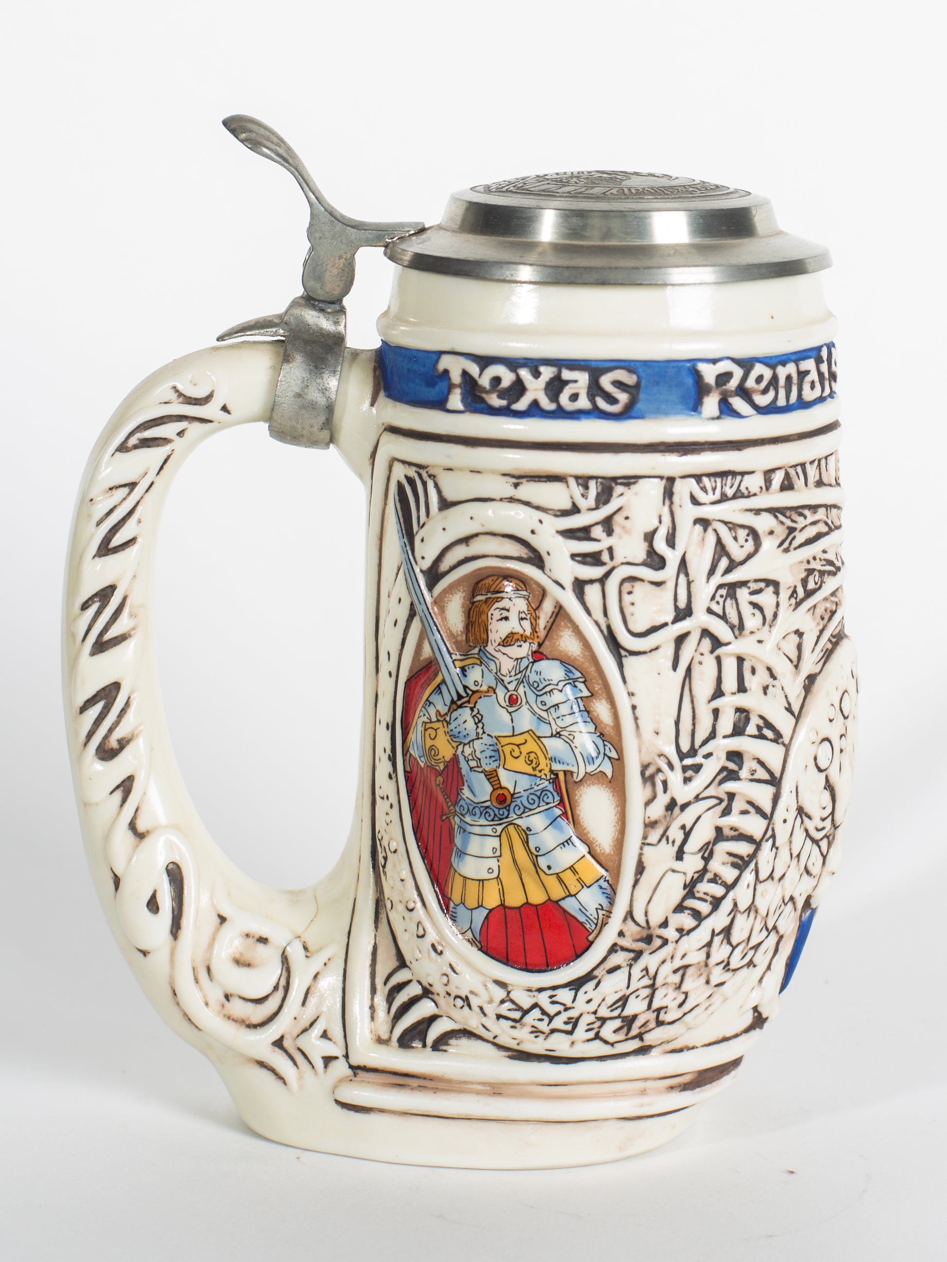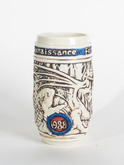 This Collectible ceramic tankard is designed with the true spirit of the DragonSlayer. Showing our most brave knight in pursuit of a retreating dragon, as his lady love looks on, this hand painted molding certainly brings to life the Renaissance. Collectible not only for its age, but also its design.
