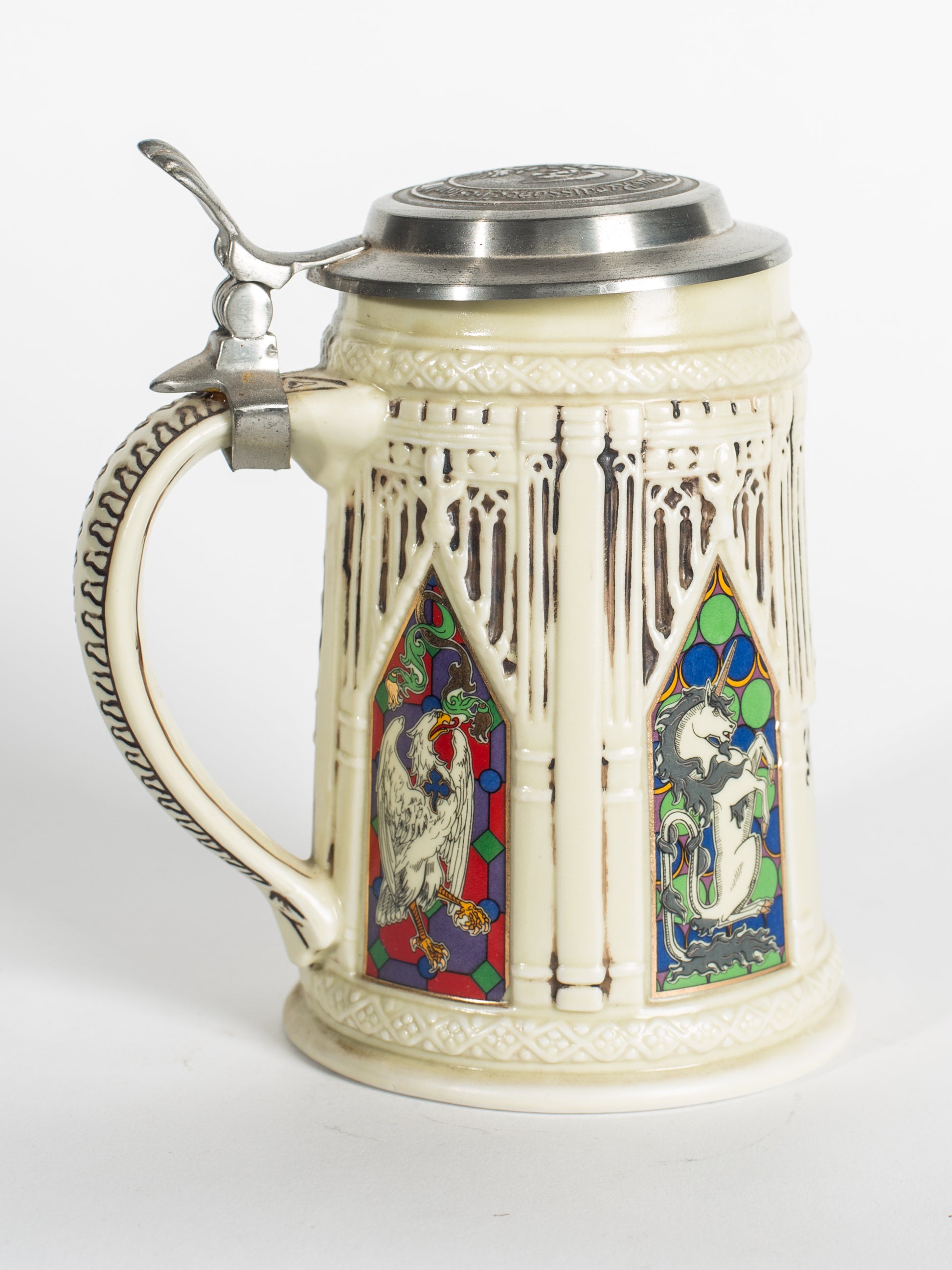 This Collectible ceramic tankard, like the 1991 tankard, features four stained glass windows each adorned with different fauna of significance. Designed to bring humans and nature together in one image, this vessel speaks volumes.
