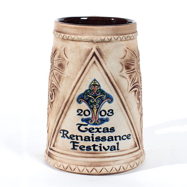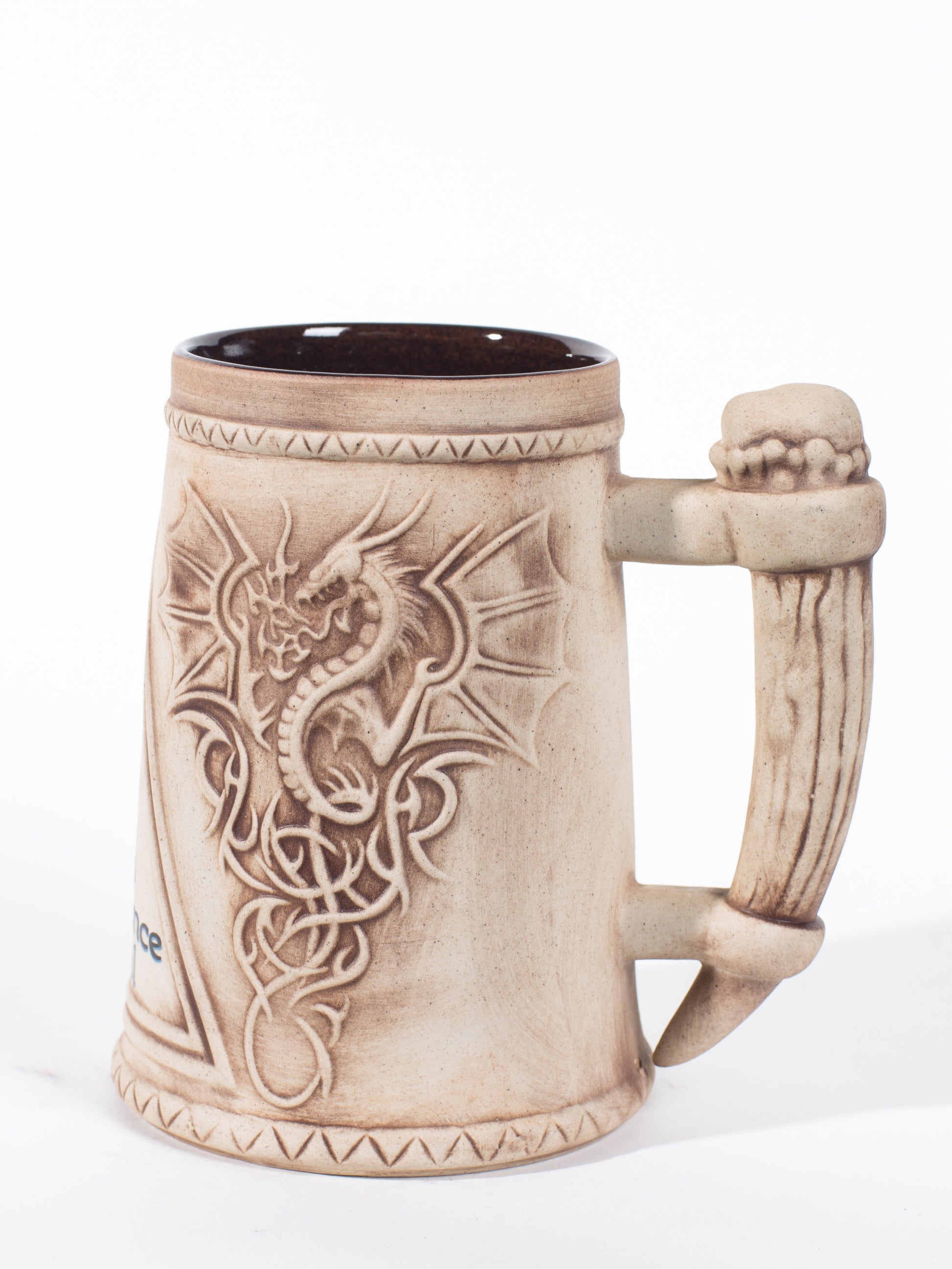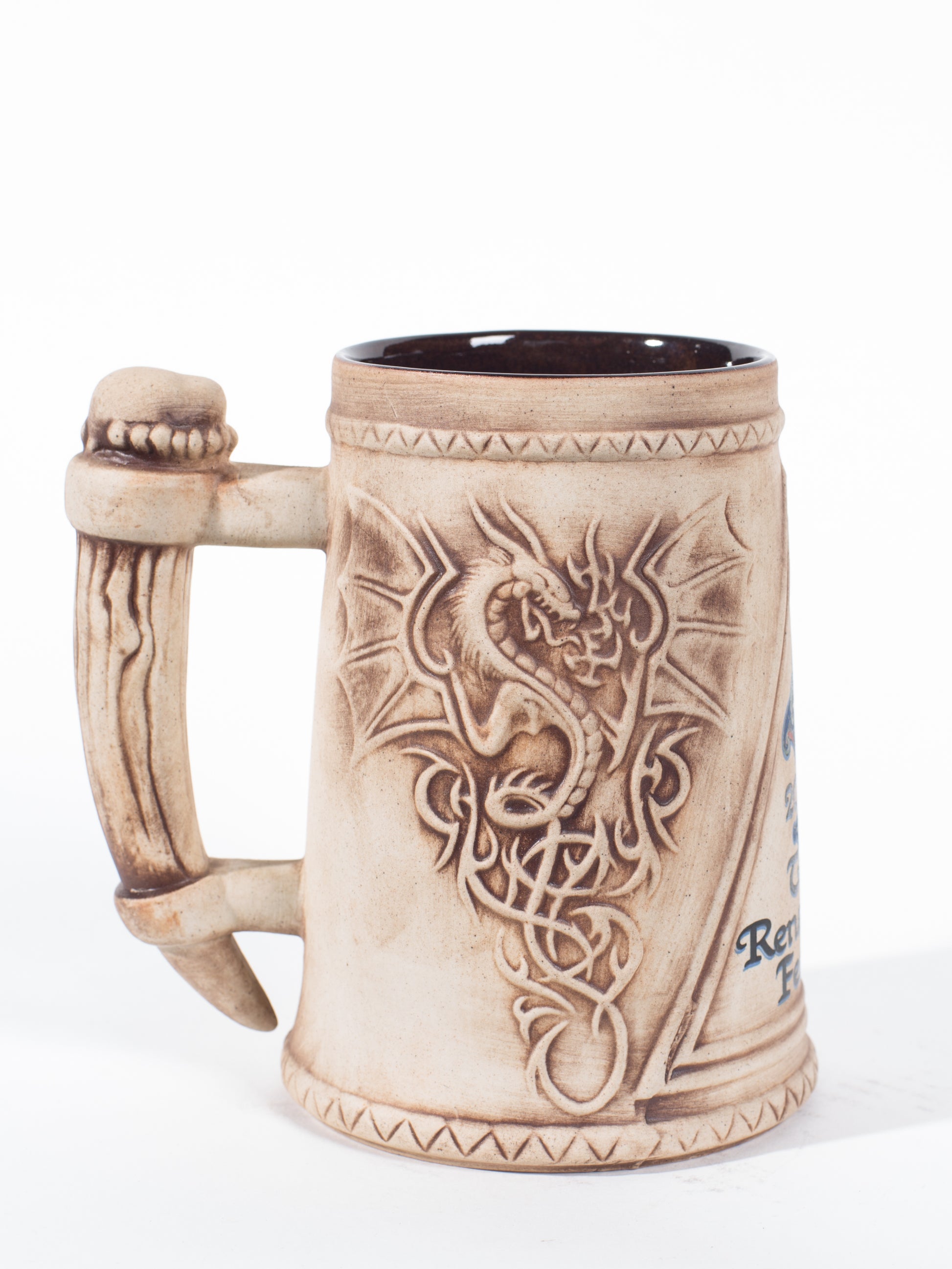 This Collectible tankard shows the detailing of what an overall antique glaze can do. The central design uses bold colors to keep the focus on the overall look of this drinking vessel, and the dark inside keeps you wondering how much ale you’ve really had!