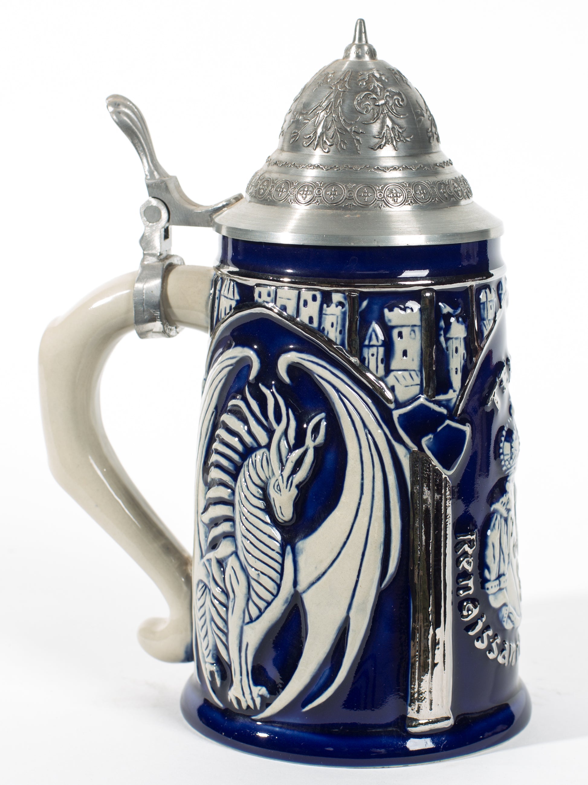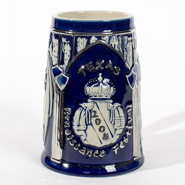 Glazed in a traditional German-style dark blue glaze, this design harkens back to the Tankards of old. A royal suit of armor with pillar artwork surrounding it, is highlighted as a focal point with the sheen of this white hand-painted design.